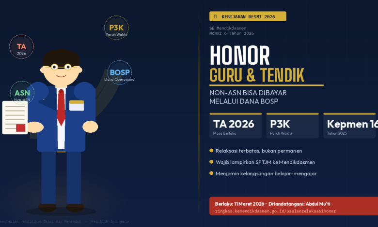 Menteri Pendidikan Dasar dan Menengah (Mendikdasmen) Abdul Mu’ti resmi menerbitkan Surat Edaran (SE) Nomor 6 Tahun 2026 pada 11 Maret 2026. Surat edaran ini mengatur tentang Pelaksanaan Relaksasi Pembiayaan Komponen Honor Guru dan Tenaga Kependidikan Non-Aparatur Sipil Negara pada Dana Bantuan Operasional Satuan Pendidikan (BOSP) Tahun Anggaran 2026.